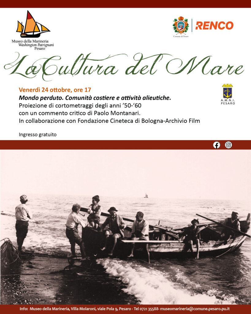 Mondo perduto è il titolo scelto per la visione di brevi filmati che illustrano alcuni aspetti di vita e di lavoro tra terra e mare che rivelano un’umanità scomparsa e saranno arricchiti da un commento cristico di Paolo Montanari. Non si tratta solo di volti e paesaggi ma di un ritmo profondo, archétipo umano, quella percezione antica di vivere il tempo naturale delle cose. È l’Italia contadina e marinara con la sua cultura della sopravvivenza ricca di artigiana saggezza, di tecniche di produzione particolarissime e di saperi tramandati da genitori a figli. A restituirci questo paese, scomparso negli anni Settanta, restano le immagini dei film, documentari brevi, di notevole fascino, provenienti dall’archivio della Cineteca di Bologna che li ha gentilmente concessi al Museo della marineria di Pesaro. Ingresso gratuito.